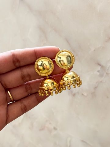 925 sterling silver with 22-carat gold plating. The most classy, traditional, yet modern, the simplest most elegant pair of Jhumkis one can own.